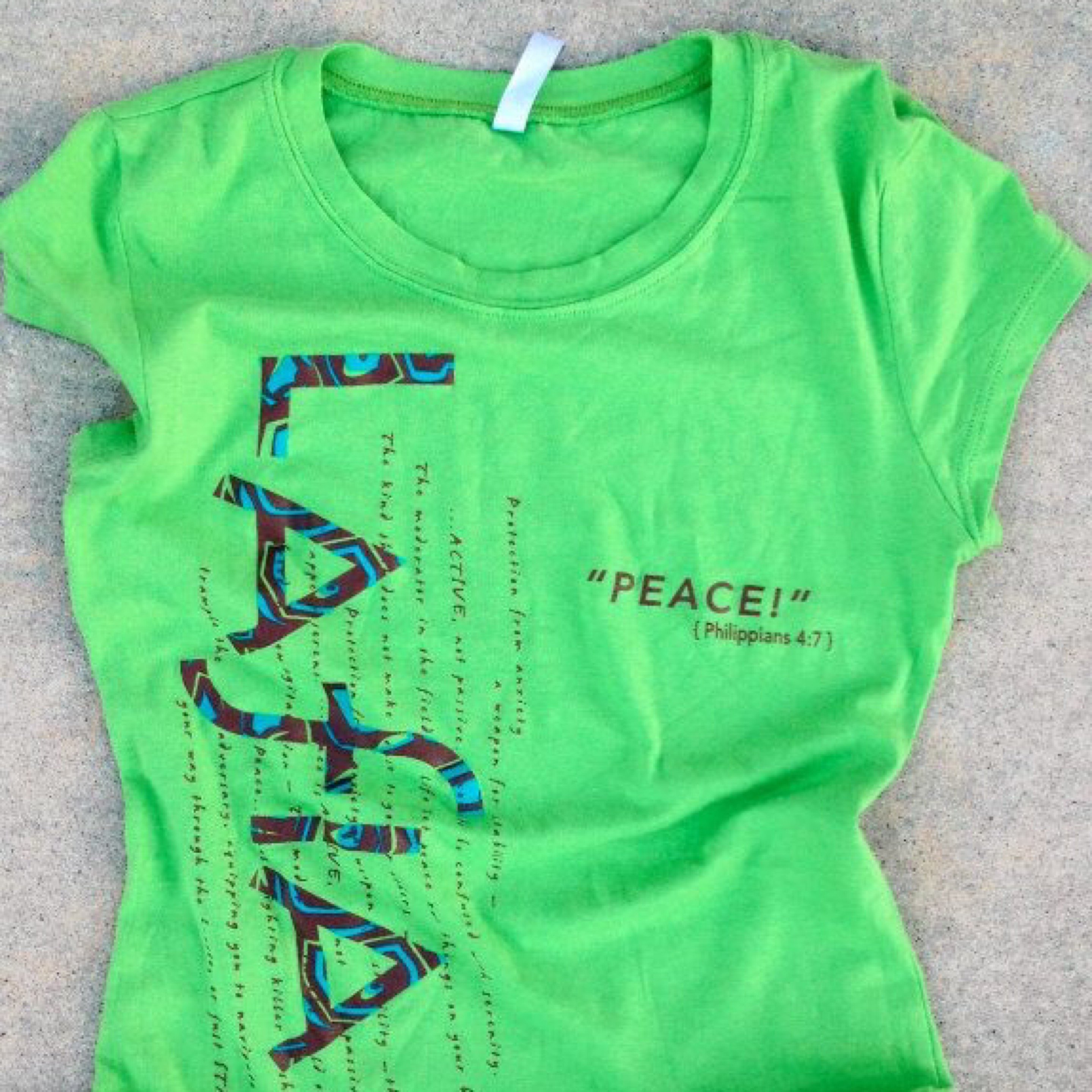 Lime Green with Traditional Print Style Front: Peace Back: Lafia “peace” (in Hausa or Nupe). Protection from anxiety, a moderator and weapon of stability; …peace is ACTIVE